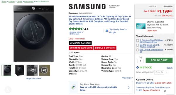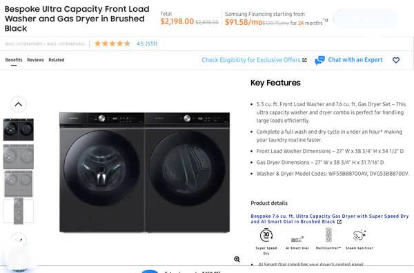 Up for sale brand new Samsung Bespoke 5.3 cu. ft. Front Load Washer and 7.6 cu. ft. Gas Dryer Set – This ultra capacity washer and dryer combo is perfect for handling large loads efficiently. Complete a full wash and dry cycle in under an hour* making your laundry routine faster. Front Load Washer Dimensions – 27" W x 38 3/4" H x 34 1/2" D. Gas Dryer Dimensions 27" W x 38 3/4" H x 31 7/16"D