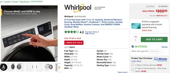 Up for sale brand new out of box Whirlpool WGD5605MW, 27 Inch Gas Dryer with 7.4 cu. ft. Capacity, Advanced Moisture Sensing, Wrinkle Shield™, EcoBoost™, 36 Dry Cycles, Sanitize Cycle, Quad Baffles, Intuitive Controls, and ENERGY STAR® Certified: White. Retail over $1100, Selling for $550 Cash pick up only. Please contact Rob at (213)210*39*90 Only if price and item is right for you. For additional info visit their website. No emails would be answered, Sorry. If you see this post still available, don’t ask.