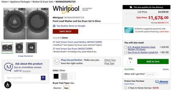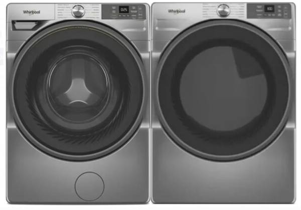 Up for sale brand new out of box Whirlpool WFW5720RR.27 Inch Smart Front Load Washer with 4.5 cu. ft Capacity, FreshFlow? Vent System, Dry Drum Cycle, FanFresh? Option, Antimicrobial Protection, AI Intelligent Wash, Quick Wash & Dry, Whirlpool? App, Family Share, Sanitize, Steam, ADA Compliant and Energy Star Certified: Radiant Silver. And Whirlpool WGD5720RR