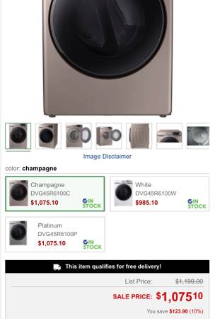 Up for sale brand new in the box Samsung Model: DVE45R6100C 27 Inch Electric Smart Dryer with Steam Sanitize+, Sensor Dry, 12 Dry Cycles, 10 Additional Dryer Options, Bixby Enabled, 3-Way Venting, Reversible Door, ADA Compliant, ENERGY STAR and 7.5 cu. ft. Capacity: Champagne.WiFi. Retail over $1200, Selling for $650 cash pick up only. Please call or text Rob at (213)210*39*90, only if the price and color right for you. For additional specs go to Samsung website.