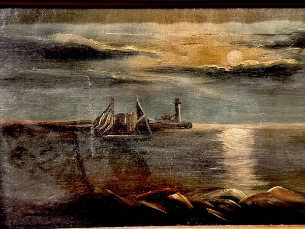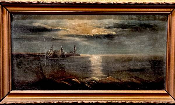 Overview: Up for sale is an incredible antique oil painting depicting a nocturnal scene of moonlit ships and a distant view of the Portland Head Light lighthouse. An absolutely stunning painting. Painting is unsigned and undated, but there is some writing in pencil on the back of the stretcher bars, which appears to read, "Looking From ... Portland ..." I would estimate it to date to the 1910's or 1920's, based on style and wear. I'll be listing a few other paintings that I acquired together with this one, done by the same artist (one of which shows a daytime scene of the Portland Head Light). Please check my other listings. Framed in a lovely detailed carved wood frame, though it is slightly loose in the frame.