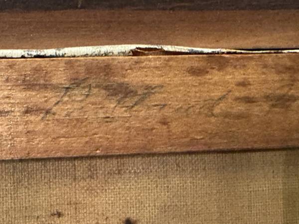 Condition: Painting is in fair condition, with some noticeable slits/repairs in the canvas, and minor rumpling, cracquelure. Frame is in very good condition.