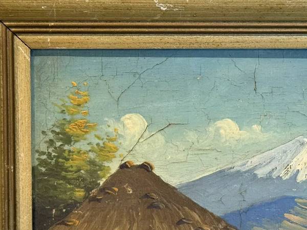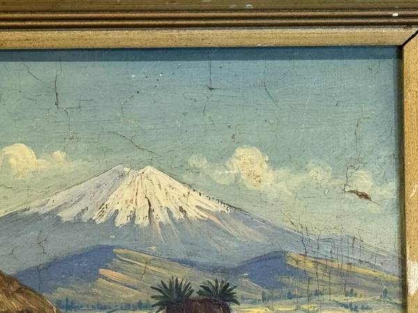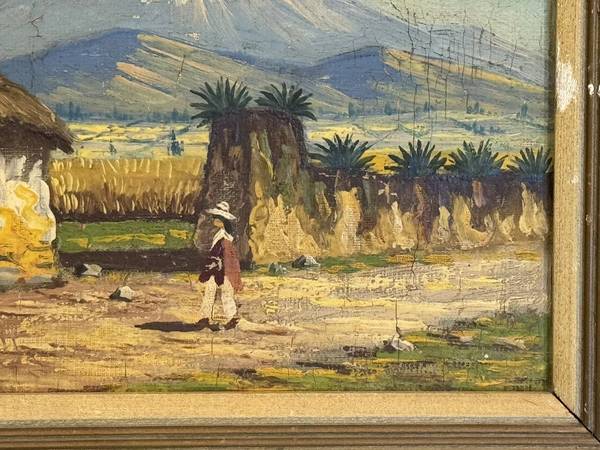 Overview: Up for sale is an incredible antique oil painting on board of a South American mountain village. It depicts a few villagers with a large mountain in the background. It is signed M. Arturo at lower left. Based on age and wear, I'd date this to the 1940s. Framed in a period blond-wood frame.