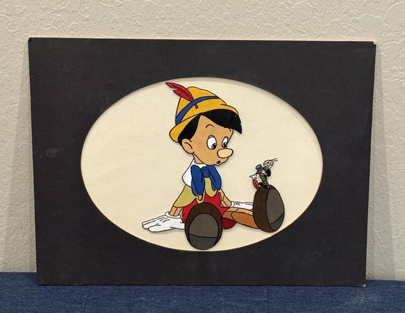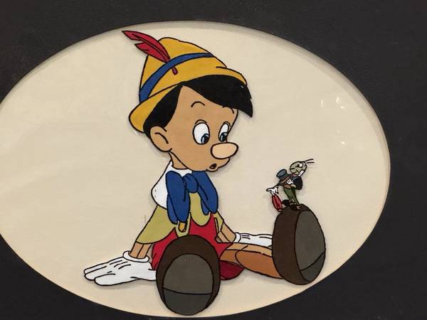 Overview: Up for sale is an original production cel from the movie Pinocchio, depicting Jiminy Cricket on Pinocchio's shoe. I acquired the cel from the estate of a gentleman that worked as a Disney animator in the 1990s, and my understanding is that he came into possession of it while working at Disney. It is not signed, numbered or authenticated.
