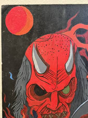 Overview: Up for sale is a fantastic oil painting on canvas board featuring a demonic reverie, with a horned demon figure at left, a winged skeleton at lower right and and wide-eyed skeleton skull at upper right, all ringed in red flames. The piece was painted by Frank Chavez. It is unsigned, but I have another piece listed by this artist that is signed and they were acquired together. It is titled, "The Ultimate Flesh" en verso. An incredible horror piece. It is unframed. It is undated, but I would estimate this to date to the late 1980s or early 1990s.