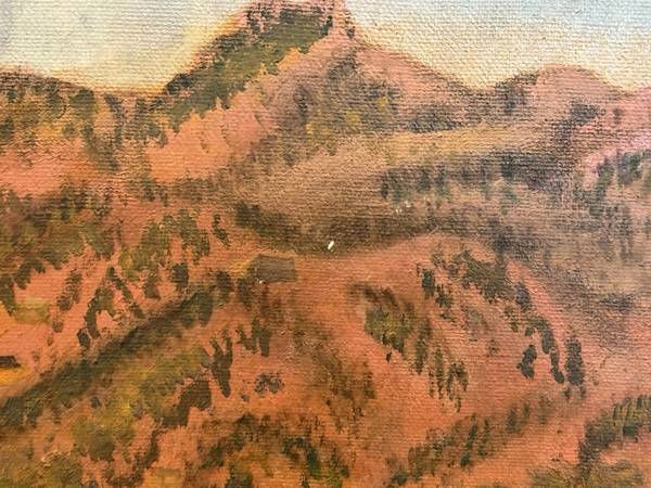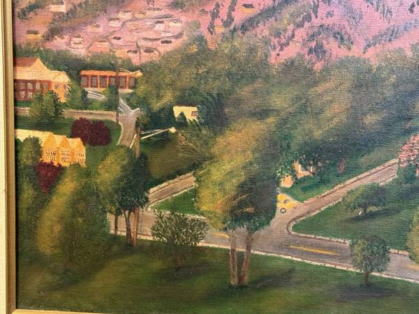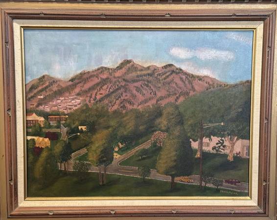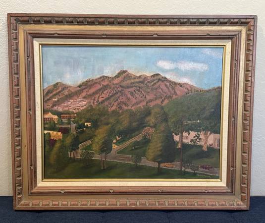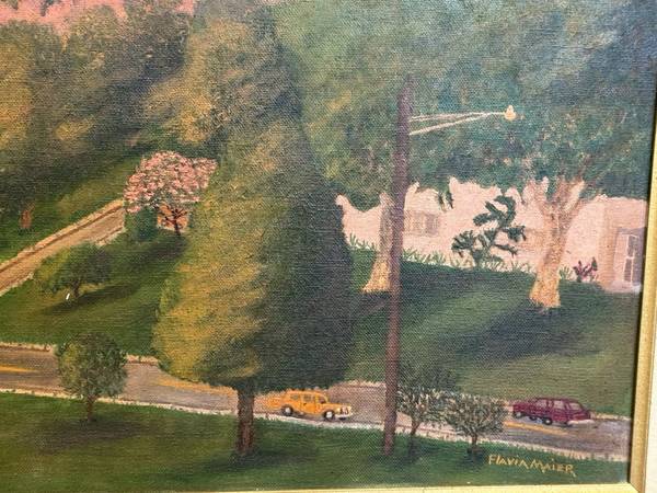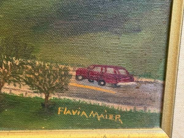 Overview: Up for sale is a fantastic vintage midcentury oil painting on canvas depicting a mountain townscape with a highway exiting town. It is signed "Flavia Maier" at lower right. Based on style (including the look of the cars), I'd date this to the 1950s or so. A really cool and well-executed piece. Framed in a lovely carved wood frame with linen matting.