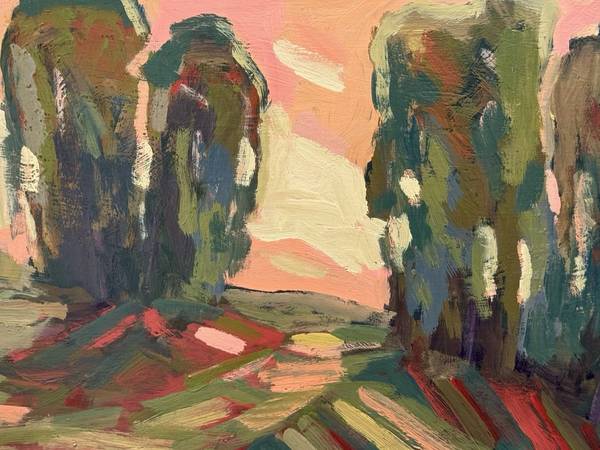 Overview: Up for sale is an incredible fauvist oil painting on board by listed Chile/California artist, Juan Guzman Maldonado (1948-2020). Guzman Maldonado is well-known for his expressionist California landscapes. This is no exception, depicting an incredible sunset scene of a eucalyptus landscape in Paso Robles, California. Painting is signed "Guzman" at lower right. It is also titled "Paso Roble" and signed en verso. Unframed.