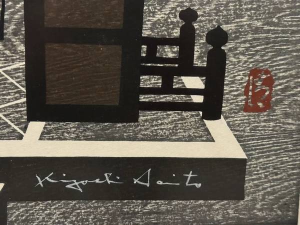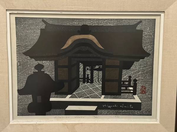 Overview: Up for sale is this fantastic woodblock print, "Kiyomizu Kyoto" by modernist Japanese printmaker, Kiyoshi Saito. It depicts a scene of the iconic Kiyomizu Temple in Kyoto. Saito is famous for being one of the earliest Japanese print artists to move from traditionalist styles and themes to more modern art-style subjects. This is titled "Kiyomizu Kyoto" at bottom center, numbered 17/100 at bottom center and dated 1963 in pencil at lower right. Print comes matted and framed in an extremely heavy wooden frame that appears to be period. There is a plexiglass that covers the print itself.