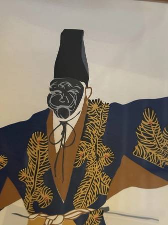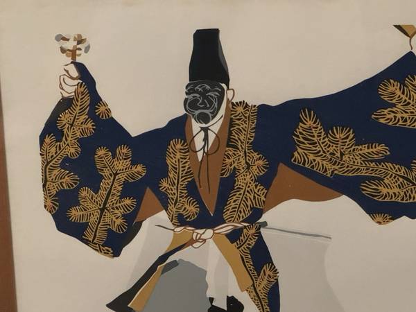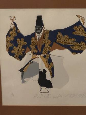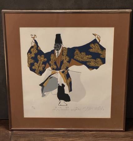 Overview: Up for sale is a fantastic woodblock print, "A NO Play - Sanbasoh Yamagata Prefecture" by listed Japanese artist, Masaaki Tanaka (1947-). Tanaka is well-known for his prints of various Japanese festivals. This is no exception, depicting an actor in the Noh play titled "Sanbasoh" in the Yamagata Prefecture. Signed at dated "'75" at lower right. Titled in pencil at center and numbered 109/135 at lower left. Professionally matted and framed in a silver metal frame under glass.