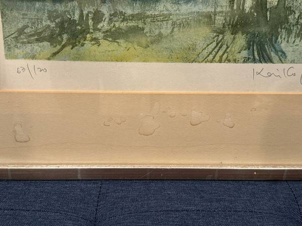 Condition: Aquatint is in excellent condition. Frame is in good to very good condition. The matting has moderate toning and staining along the bottom.