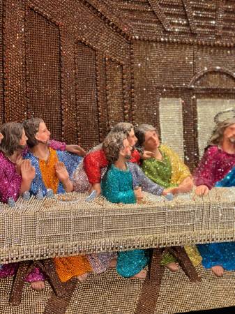 Elevate your space with this breathtaking custom handmade depiction of The Last Supper, meticulously encrusted with shimmering crystals. A true labor of love and craftsmanship, this piece took nearly 9 months to complete and is inspired by the opulent aesthetic of B.B. Simon’s luxury crystal artistry. Perfect for collectors of religious art or anyone with a taste for dazzling, statement-making decor.