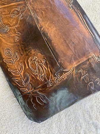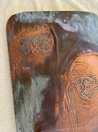 Tall & Narrow Copper Relief of a Sad Figure Next to some birds and a plant. Sun Above. Signed by H R 76. 11 Inches X 29 Inches Tall. Rear Has 2 Small Wooden Bars One With A String For Hanging....