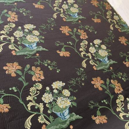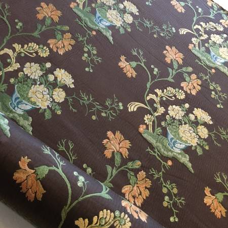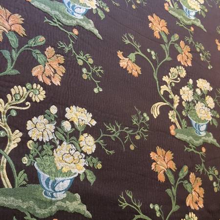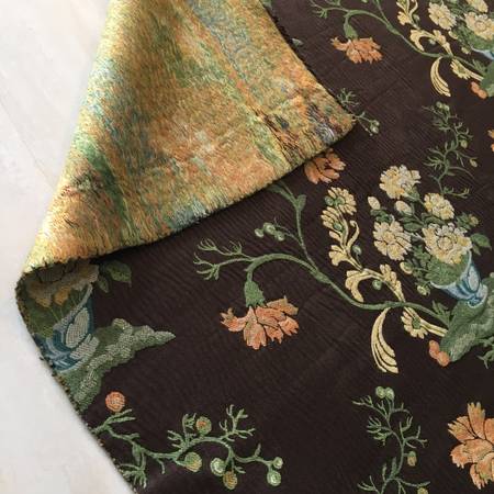 A Beautiful, Extra Heavy and Rare Washed and Soft Tapestry Fabric / Upholstery Fabric Triple Woven with colorful Victorian Floral in Vase raised Pattern on a Brown background.
