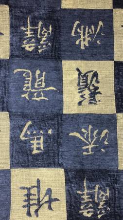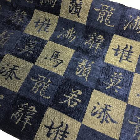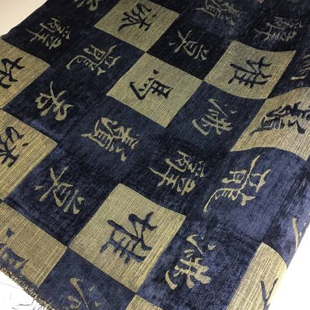 A Beautiful, Durable and Rare Washed and Soft Upholstery Fabric / Kanji Fabric / Oriental Fabric, Woven with blue chenille squares and Japanese/Chinese Symbols. This Fabric is made in Japan.