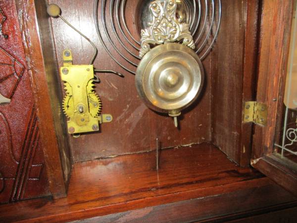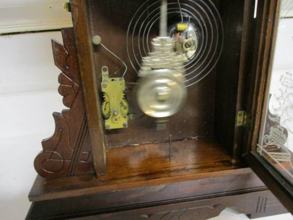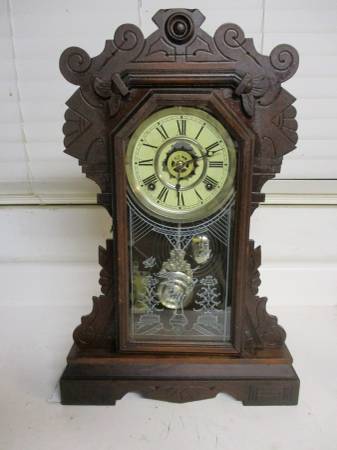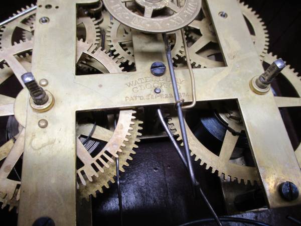 For sale is a Waterbury Shelf Clock. The clock is in fine running condition, the clockworks were recently cleaned and oiled. The clock will chime on the hour and half hour, and it will run for one week on a single wind. The movement is dated Sept. 22, 1874.