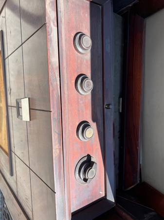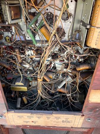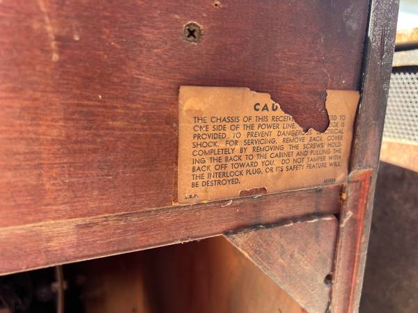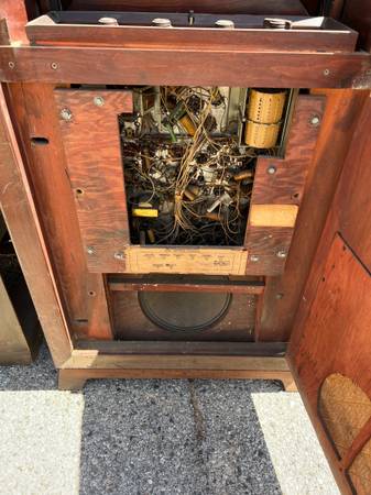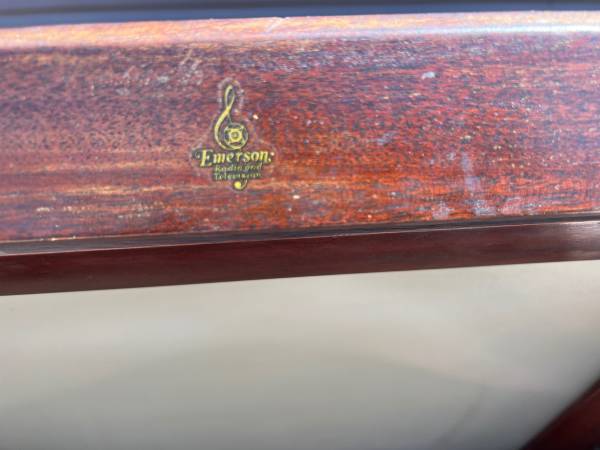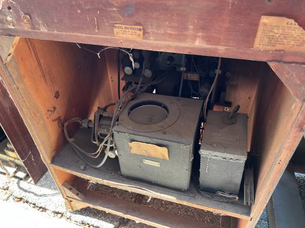 Vintage Emerson Model 609 projection television console (circa 1949–1950). Beautiful mid-century wood cabinet with hinged projection screen, original control knobs under the lid and fabric speaker panel.
