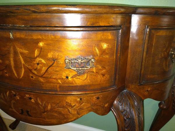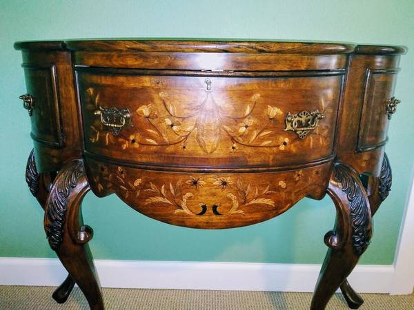 Very sturdy and solid piece. One small chip on a top. Front drawer closed. No key. Structurally healthy with small signs of aging, overall, in a good state of conservation.