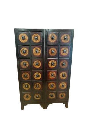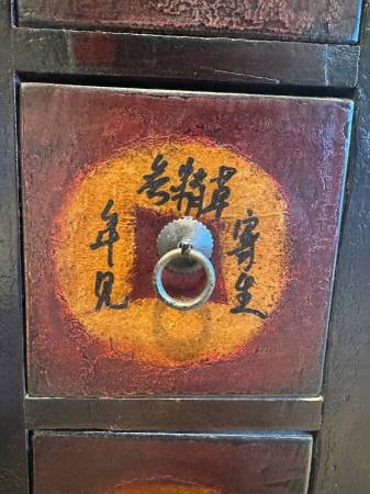 This vintage Oriental chest of drawers set includes two pieces with metal handles. With 24 drawers, this chest provides ample storage space while adding a touch of elegance to any room. The chest measures 50 inches in height, 34 inches in length, and 14 inches in width. The Oriental theme and the calligraphy details of this chest adds a unique touch to your home decor. No assembly is required, and no additional parts are needed. This chest of drawers set is perfect for those who want to add an exquisite touch to their living space.