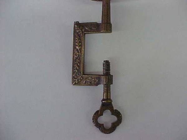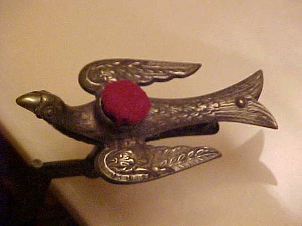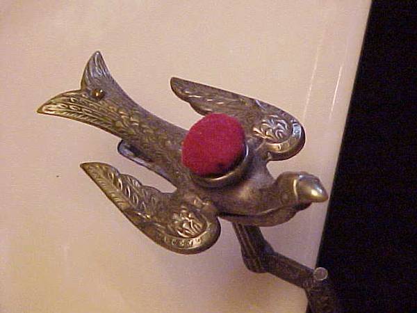Fastens/clamps to the edge of a table. The beak spring holds the fabric to be sewn. Patent date Feb.15 1853 is shown on the edge of the wings. As you can see ornate patterns are cast into the bird, clamp, and handle