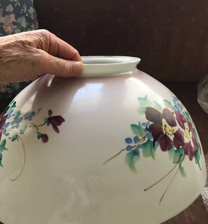 Beautiful Antique Original 1880s - 1920 Hand Painted Milk Glass Hanging Oil Lamp Shade. Also can be used for Victorian table lamp. The top (fitter) is 6" dia, base is 14". Great Condition! $145 OBO