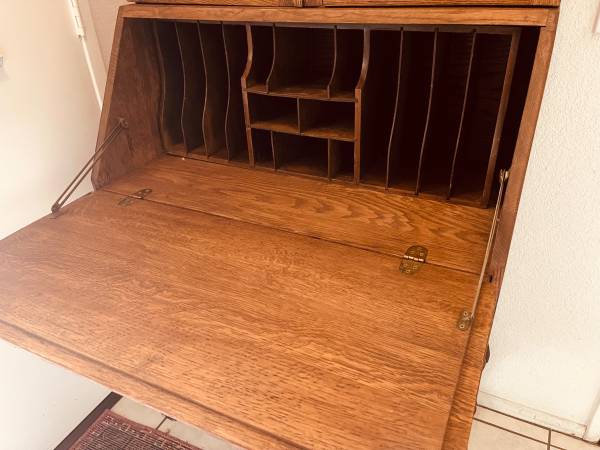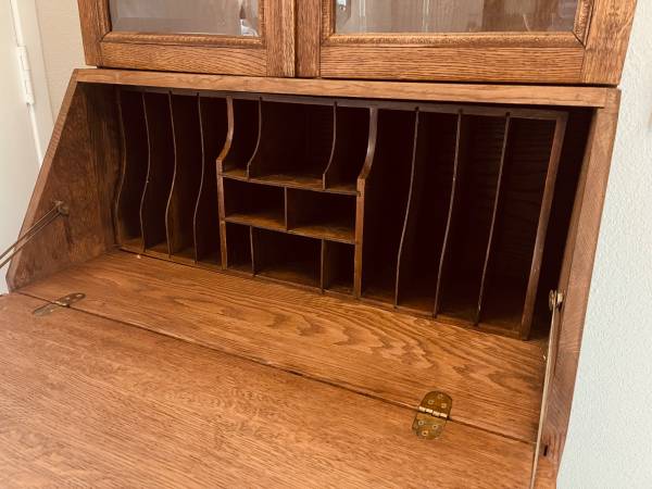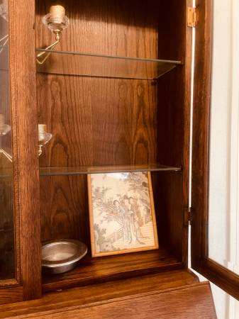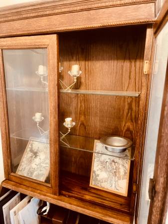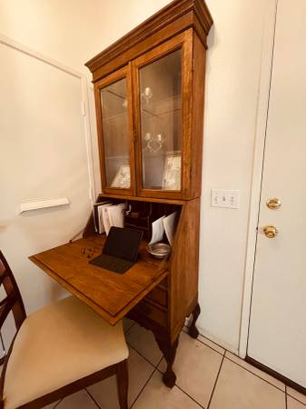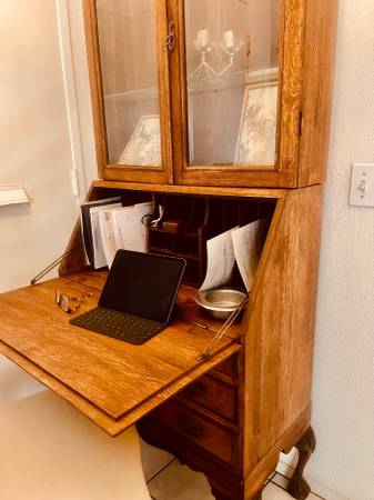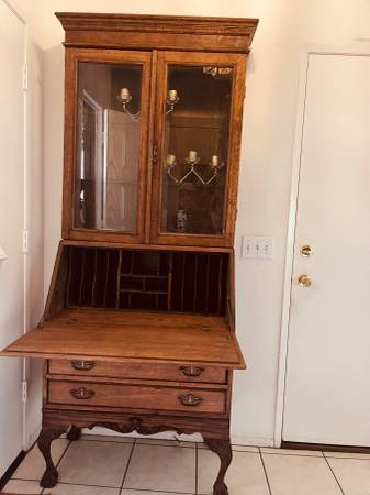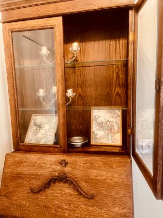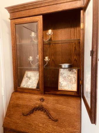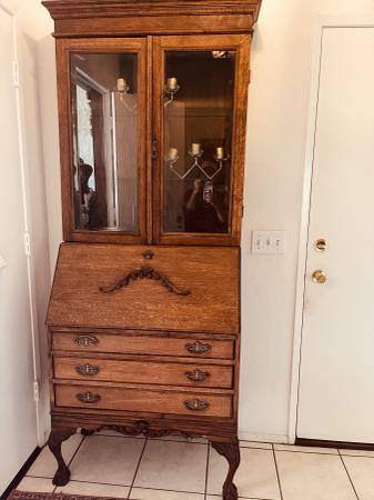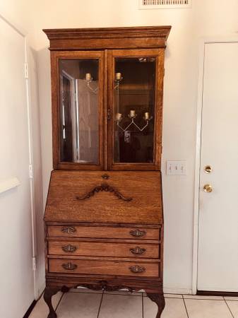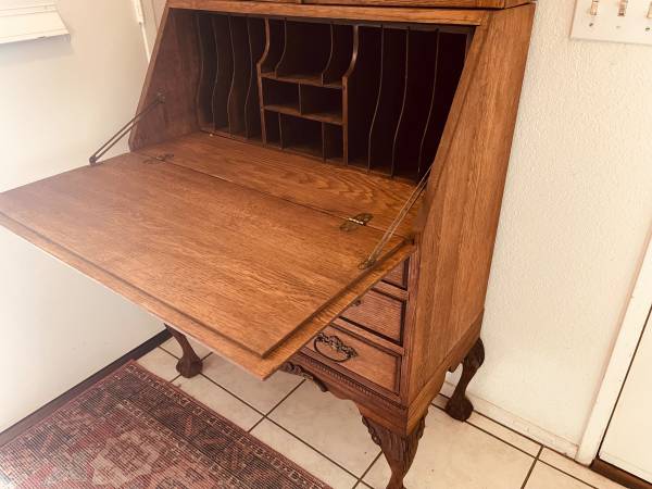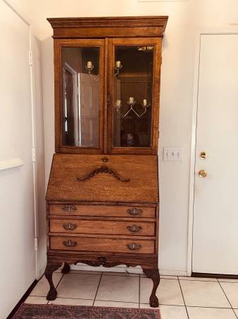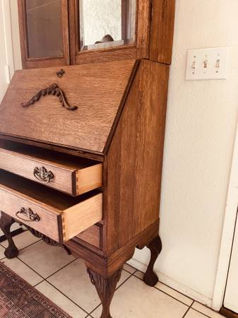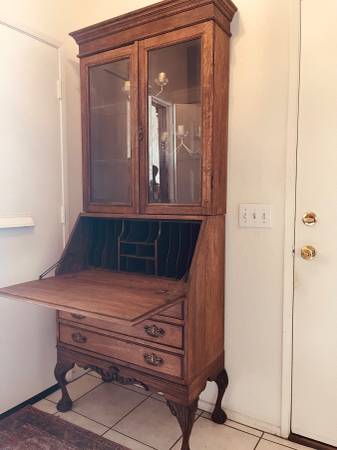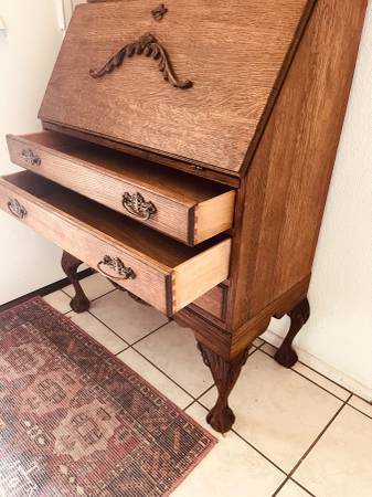 Up for sale my uncles antique Chippendale solid oak secretary desk bureau dresser buffet display organizer combo ! This lovely secretaire desk is made of solid oak wood it is in excellent condition considering its age, all the drawers slide in out easily and the drop down writing section of the desk works as it should. This solid oak desk has traditional chippendale style and design, it has a large silhouette, ball and claw feet, beautiful facade front, and comes in antique oak patina finish. This charming desk has a drop down desk writing area which works in a magically shrewd mechanical way once the drop down is let open the metal mechanism holds the drop down writing area, the inner area of the drop down is a hutch tat comes with cool pigeon holes and additional sections for organization of letters paperwork or stuff ! this secretary desk boasts with old school workmanship dovetailed drawers and antique brass hardware, the top section is a display cabinet buffet style with beveled glass fronts.