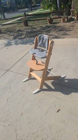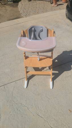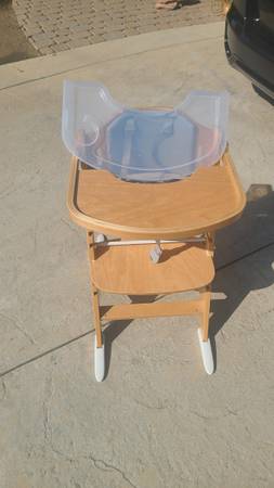 Here is a beautifully maintained, slightly used adjustable baby high chair that would be perfect for a new family starting out. Completely adjustable and compact. Comes with a snap on clear plastic tray. A slight blemish in the front of the tray is repaired by hot glue, which still works perfectly. See photos