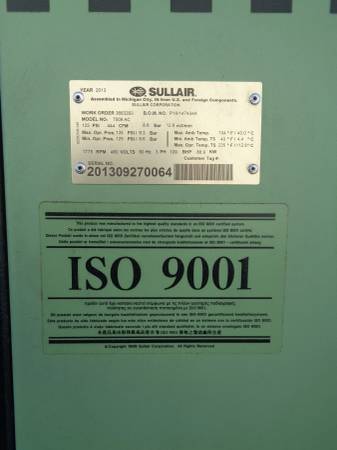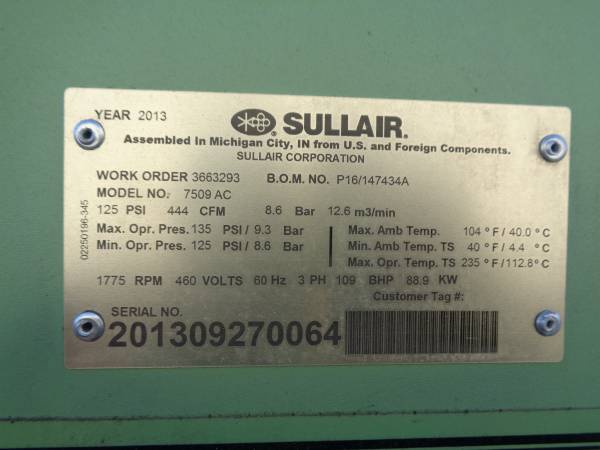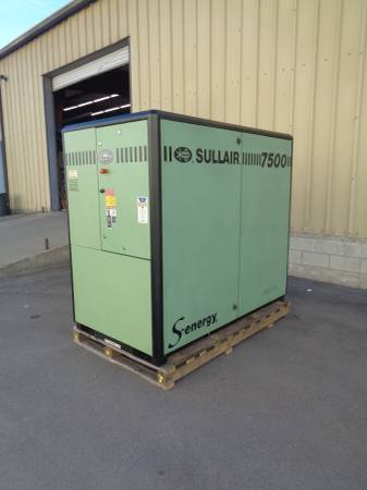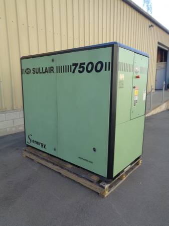 Up for sale is a nice used 2013 Sullair rotary screw air compressor, model 7509 AC. 100 hp. Wired for 460 volt, 3 phase power. Only 8,600 run hours. Rated at 444 CFM at 125 PSIG. Came from a facility closing down. One owner unit that was maintained regularly. Comes with all the original manuals. In good working order, ready to be put back into service! Can be seen under power in Santa Clarita, CA. Please see pics and email with questions.