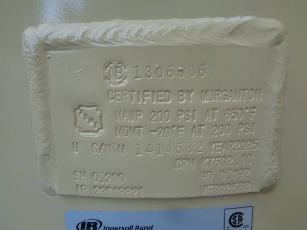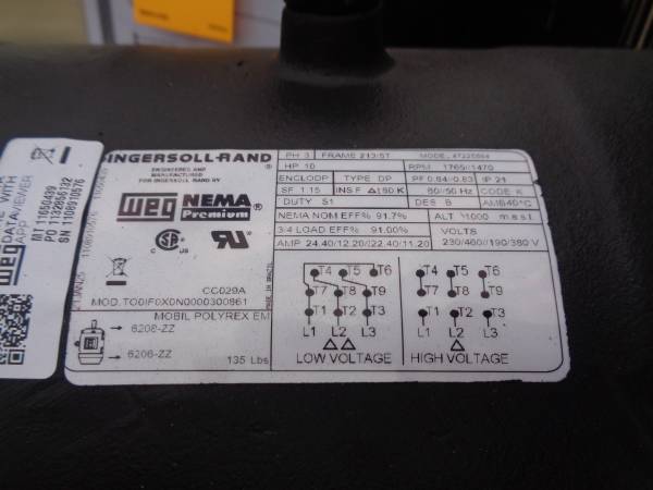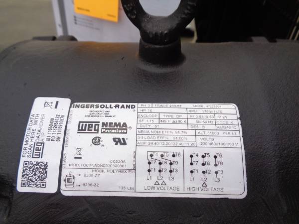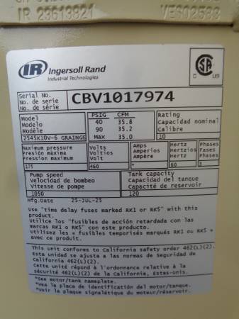 For sale is a new surplus 2025 Ingersoll Rand vertical air compressor, model 2545K10V-6. 10 hp, mounted on a 120 gallon vertical tank. Wired for 460 volt 3 phase power. Rated at 35 cfm at 175 psi. This can be seen in person in Santa Clarita, CA. New replacement is $5,558 - so buy here and save! We will load onto buyers truck. Please see pics and email with questions.