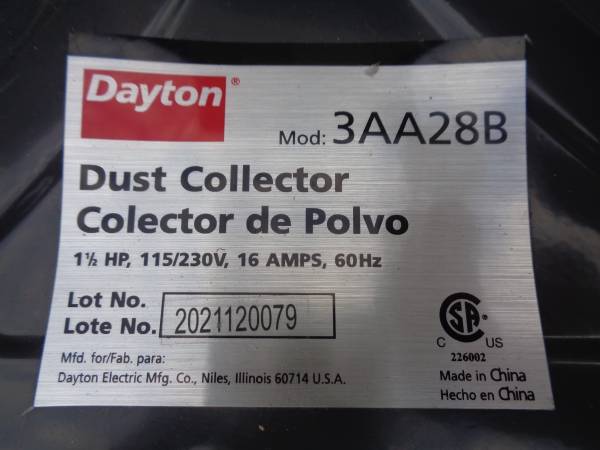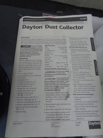 Up for sale is a new surplus Dayton 3AA28B Wood Dust Collector. It was set up and assembled but never used. Retails for $488, so buy here and save! Can be seen in person in Santa Clarita, CA. Please see pics and email with questions.