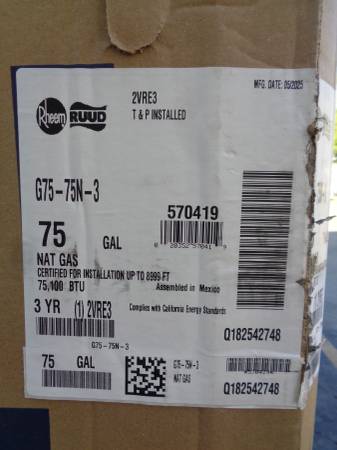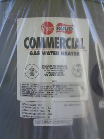 Up for sale is a new RHEEM RUUD Commercial Gas Water Heater 75 Gallon Model G75-75N-3. Grainger part number 2VRE3. Retails for $2,496 so buy here and save! Can be seen in person in Santa Clarita, CA. We have a forklift to load. Please see pics and email with questions.