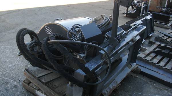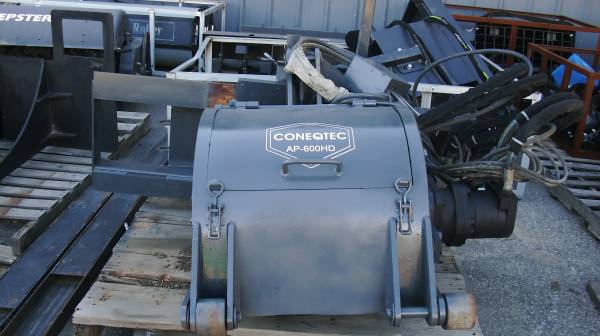 CONEQTEC BRAND MODEL AP600HD GRINDER ATTACHMENT FOR BOBCAT AND OTHER BRAND SKID STEERS. COMPLETE WITH QUICK TACH BRACKET / HOSES AND QUICK COUPLERS AND REMOTE VALVE. REQUIRES HIGH FLOW AUXILIARY...