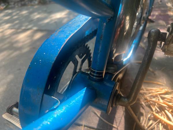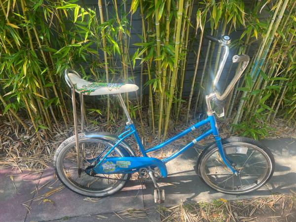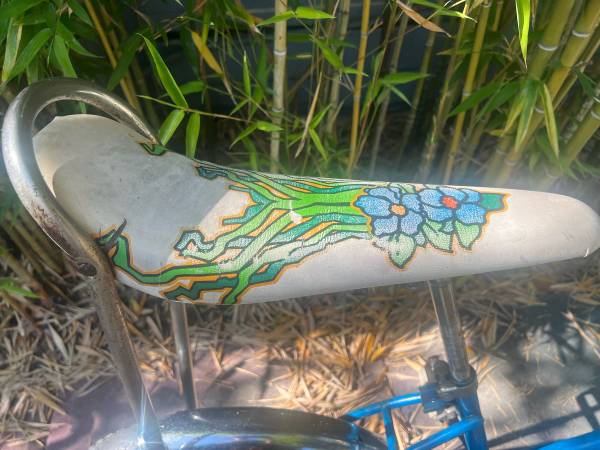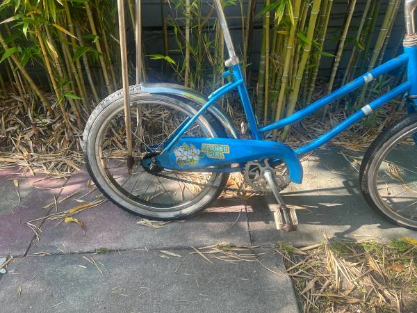 This Blue flower girl vintage banana seat bike will bring you back to the early 80s. Made by free spirit, which was sold through Sears roebuck. When that was a relevant place to shop.