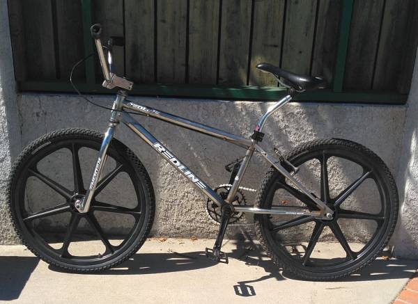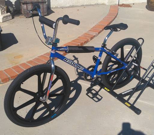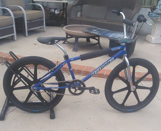1995 Feb #157 Redline Proline 24 BMX 'Skyline' Cruiser. NEW build done in Skyway blue completed 10/3. New SE Racing 24" Cub tires on ORIGINAL 7 spoke Skyway Tuff mags sealed bearings with 16T Dicta freewheel and new nickel chain. Redline cranks with custom caps, RL pedals. Odyssey threadless stem, new handlebars with AME grips. Tektro linear pull 'v' brakes with new pads- adjusted correctly. About a 3 week build and there is NO LABOR ADDED to this bike. Last photo shown before restoration.. $800