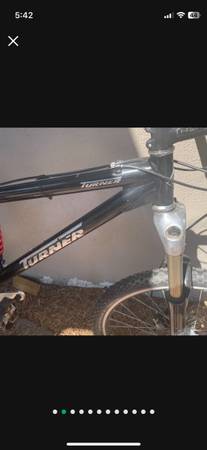 Turner aluminum full suspension mountain bike No dents or cracks. Frame is in good condition Measures 12” center to center and 17” center to top with a 22 1/4” effective top tube and a 30” standover...