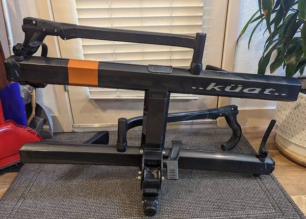 Up for sale, my wonderful KÜAT Sherpa 2.0. I love this rack. I tried several other top tier racks, but this was the only one that worked with all my bikes -- regular diamond-frame cycles, and SWB recumbents -- and did not rattle due to the brilliant receiver tightening design.
