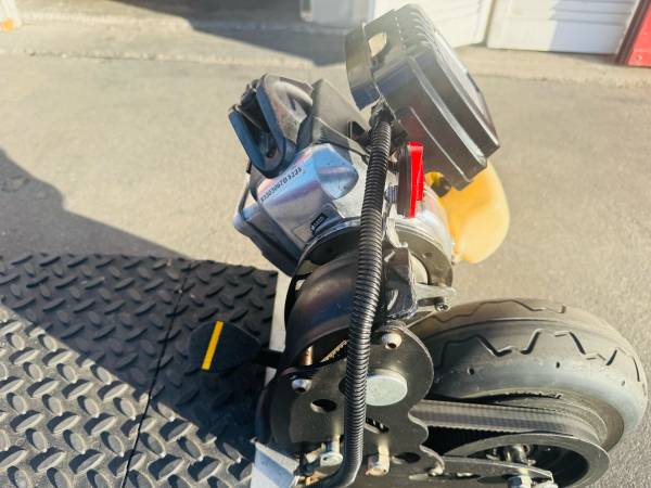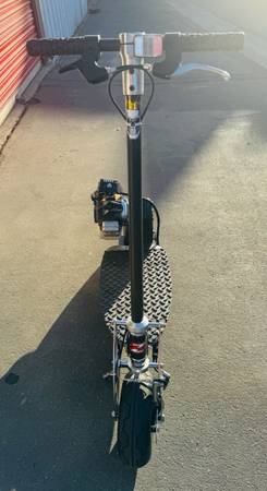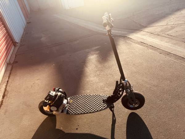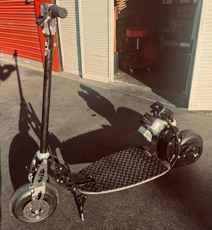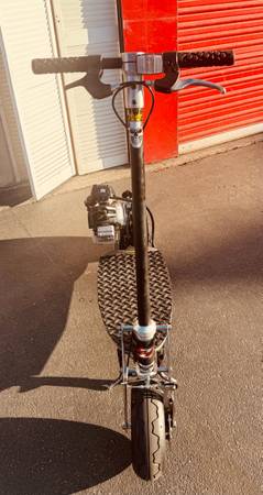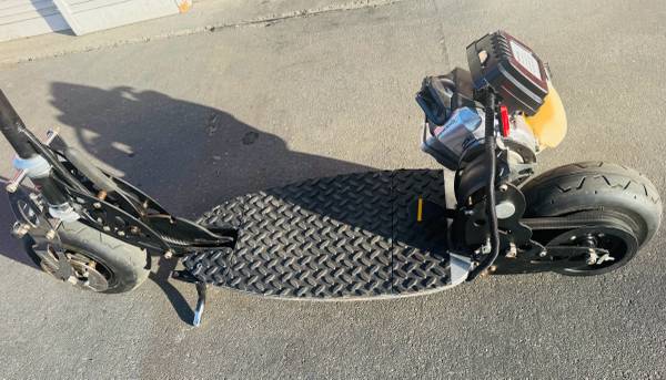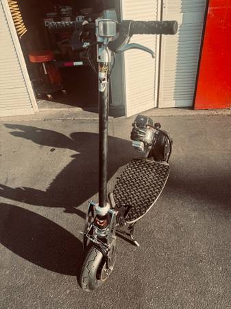 BladeZ Gas scooter 33cc engine at Top speed 30mph and on one tank of gas travels up to 50 miles. Handle bars fold down if u want to put in your trunk of your car or easy storage. Raised rubber diamond pattern on foot board for gripping wet or dry. This scooter is in great condition! You must see it to appreciate!