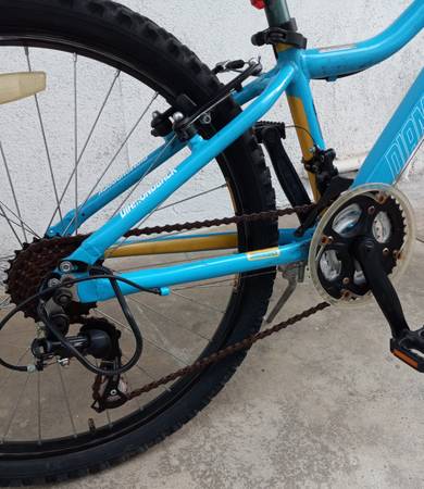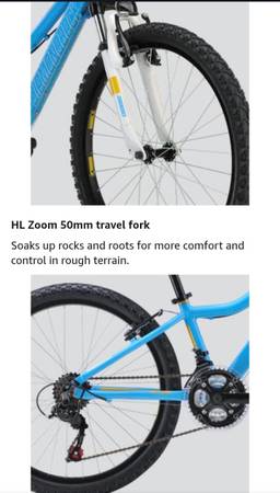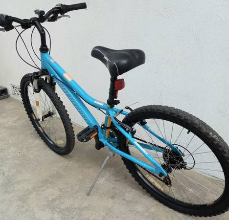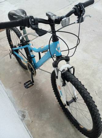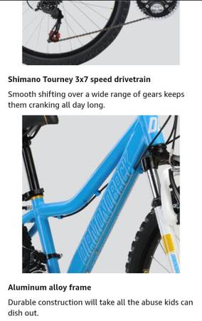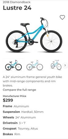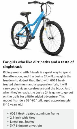 Hello..we have a very nice Diamondback Lustre Mountain bike 21 speed ,Shimano components grip shift, Shimano derailleur, with front shocks,has aluminum frame, aluminum cranks,front and rear brakes,great factory seat,great tires to 65 psi,,24 inch tires, aluminum rims,with a aluminum kickstand, And we have installed a front and back RECHARGEABLE set of lights for night riding and we will include the charging cable RECHARGEABLE off Any phone charger, these lights included with bike..all reflectors in place on bike,in great shape..this could be a boys bike as well ..24 inch tire bike are for 8 to 12 yr olds,53in to 63in height..