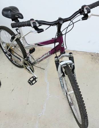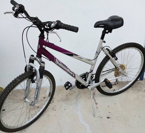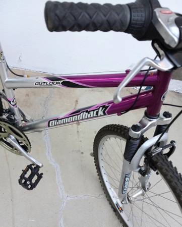 Hello..we are selling a very nice low miles ,in great condition, always garaged Diamondback Outlook woman's bike with front shocks, is steel frame,aluminum cranks, aluminum rims,tires in great condition for on-off road hybrid use to 65 lbs psi,all Shimano components, grip shift 21 speed ,great breaks,with kickstand, Avenir seat not rips or tears in over all great condition, front shocks working fine..it is a medium frame so a rider 5ft 5in to 5ft 10in..it a very comfortable riding bike adjustable seat post..quick release front back.