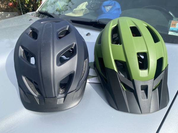 I have two brand new bike helmets that were never used. The black one is $25 and has red led lights on the back. The green one is $20. Size is 54 to 61 centimeters. CASH ONLY.