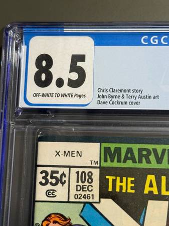 Uncanny X-Men #108 (1977) CGC 8.5 John Byrne Begins Condition : CGC 8.5 off white to white John Byrne issues Begin. Starjammers Appearance. Corsair revealed as the father of Cyclops & Havok....