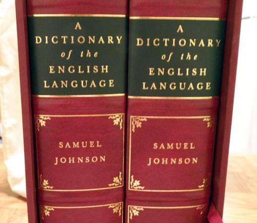 Beautiful leatherbound, 2 volume set in slipcase. We bought two originally, this is an extra copy, and an extremely rare exact facsimile reproduction of Samuel Johnson's Dictionary.