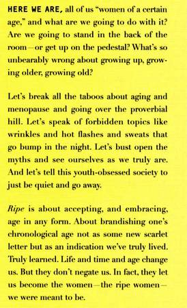 peri-menopause, menopause, and all that lies beyond. The authors don't whine, blame, or gloss over the facts, instead talking with other women, like themselves, with warmth and wit. Unlike many books in this category, "Ripe is not a compendium of clinical information. Instead it has fun quotes, quizzes, a menu of symptoms and therapies, mock-screenplay excerpts, recipes, illustrations, photographs, etc. which are are woven throughout, to reveal the myriad ways of looking at and understanding society's -- and more importantly, women's -- feelings about aging and maturing. Ripe makes it clear that this phase of life is rich in often underappreciated beauty that is much more than skin deep.