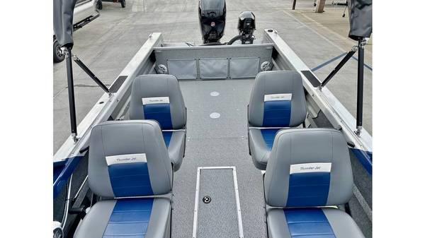 Brand New - Zero Hours - 2023 Thunderjet 205 Rush in Navy Blue. Powered with a Mercury 150HP Pro XS and a 9.9HP Pro Kicker! Options include: 2 Bank Automatic Battery Charger, 2/3 Hull Side Paint, Aluminum Pro & PDI w/ Dual Batteries, Analog Gauge Package - Tach / Trim / Hour, Bow Mount Trolling Motor Prep Package, Bow Rails, Cockpit Courtesy Lighting, Dual Battery Set-Up, Fishing Package w/ Swivels, Folding Top w/ Side & Aft Curtains, Forward in-Floor Storage Compartment, Graphics Upgrade Package for 2/3 or Full Paint, Hippo Lined Cockpit Hydraulic Steering w/ Trim Helm, Kicker Control at Helm, Kicker Motor Installation, Kicker Tie Bar Kit Installed , Locking Glove Box, Mooring Cover, Net Holder for Starboard Side, Quick Connect Kicker Fuel Supply, Shock Absorber Seat Pedestal - Helm Seat, Starboard Swim Step w/ Undermount Ladder, Stereo w/ 4 Speakers, Trailer, Upgraded Fish Seats and Washdown.