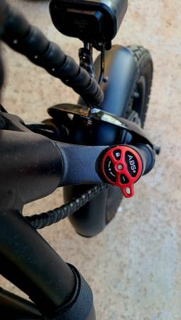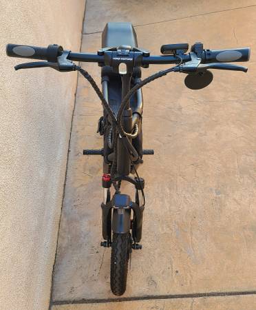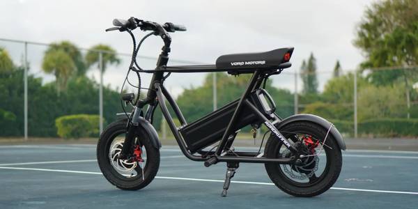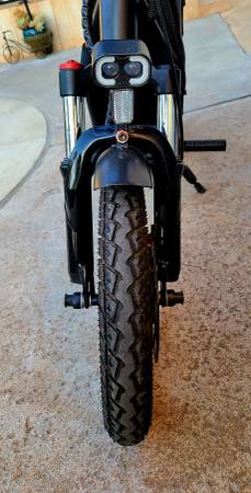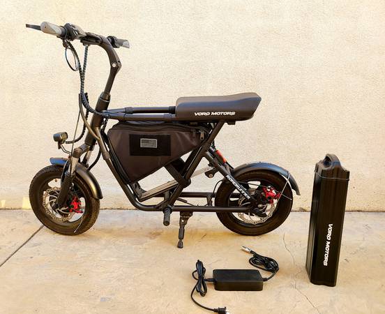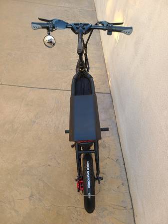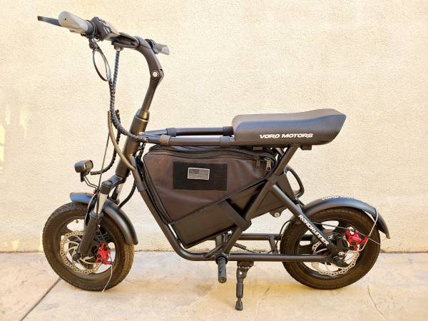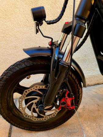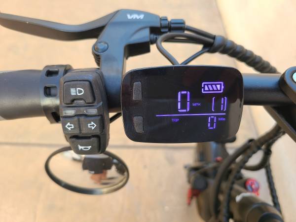 LED display, included head/tail/brake LED lights with turn signals, 3 speed settings, thumb throttle, suspension fork, long saddle, foot pegs, adjustable height handlebars, fenders, funny little kickstand