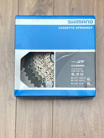 Brand new, in box, Shimano XT M8000 11-speed cassette for sale. The cassette will shift flawlessly with a Shimano 11-speed shifter and derailleur. Reason for selling is that I am converting my drivetrain to SRAM GX.
