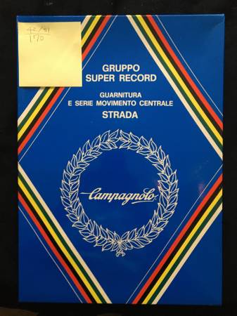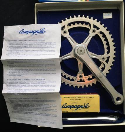 Brand New in Box. Vintage, Rare, Beautiful. Campagnolo super record cranks, 170 mm in length with 51/42 rings. Dust caps, crank bolts, and a bottom bracket are also included.
