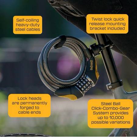 Please call Medium-Duty Security: 6’ x 0.47” self-coiling braided steel cable. User-Settable Combo: Steel Ball Combo gear system with 4-digit combination. Durable Design: Vinyl coating protects...