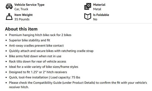 This rack was only used a couple of times. its practically new. Premium hanging hitch bike rack for 2 bikes. Designed to fit 1.25" or 2" hitch receivers