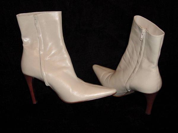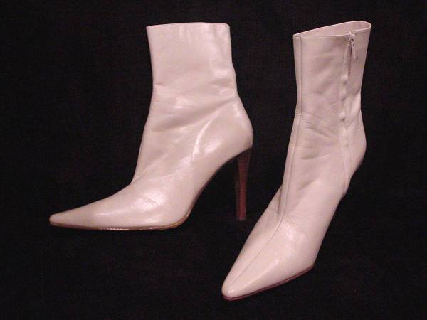 I coordinate runway fashion shows and every now and then we have some clothing or shoes that never ended up being worn in the show, so we usually sell them off at HALF the WHOLESALE value! This is a gorgeous pair of BRAND NEW genuine leather ankle high boots in a winter-white (cream) color. The have a side zipper, a pointy toe, and a 4" high wood heel. They are U.S. size 8.5 for ladies. They were originally $149 so we are blowing this one pair out at ONE THIRD off, even though they are literally brand new and have never even been tried on. GREAT DEAL!