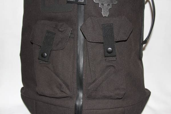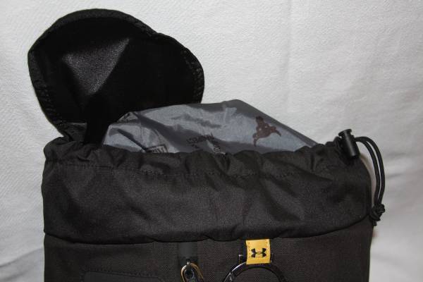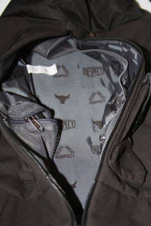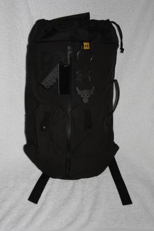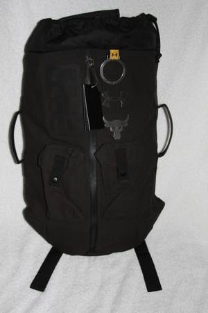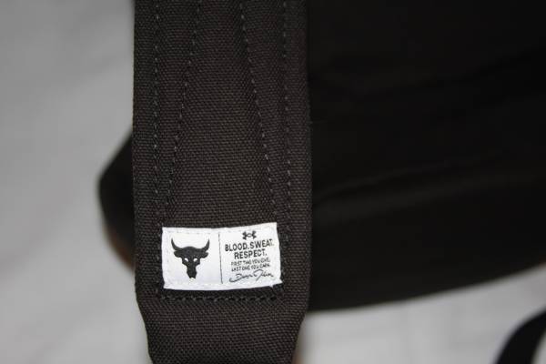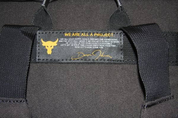 It's made out of a strong canvas material, providing ultimate durability. Top carrying handle and two side handles. It's adjustable, padded and has HeatGear shoulder straps for extra comfort. It has a side zipper entrance to main compartment and an adjustable elastic cinch top storage compartment. There are lots of interior pockets for organization, including a velcro pocket and two insulated zippered mesh pockets to keep your snacks or drinks cool. Two expandable pouch snap pockets. Two loops around bottom for easy carrying of your weight belt. There is a super soft-lined laptop sleeve on back (can hold up to a 15" MacBook Pro or similarly sized laptop)....this zipper is semi hidden. There is a woven label on back with an inspiring message from The Rock. On the outside, there are various places to clip/attach your keys, flashlight, hand sanitizer.....